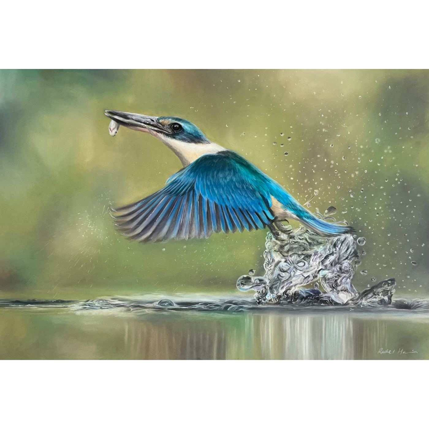 Riverside TakeawayAzure KingfisherRachel Harris Original dry pastel drawing on pastelmat 50cm x 35cm Framed L67cm x W53cm x D2cmRachel is a nipaluna/Hobart based artist, science nerd...