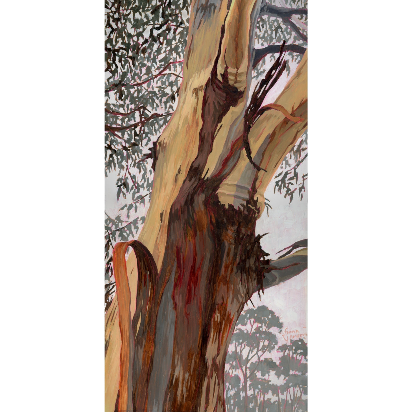 Each tree is unique - not only in their patterning, colours and textures, but in the way they have been shaped by their surrounding environment. Like us, each tree bears the impact of a lifetime’s experiences - from growth and aging, to accidents and trauma. Whenever I encounter these tangible alterations in eucalyptus trees I am reminded of the ways in which life choices and circumstances have impacted me. As I paint these trees and their leafy offerings, I contemplate seasons of new growth; amputated dreams; physical ageing; scars from difficult relationships and the temporary nature of life on this earth.